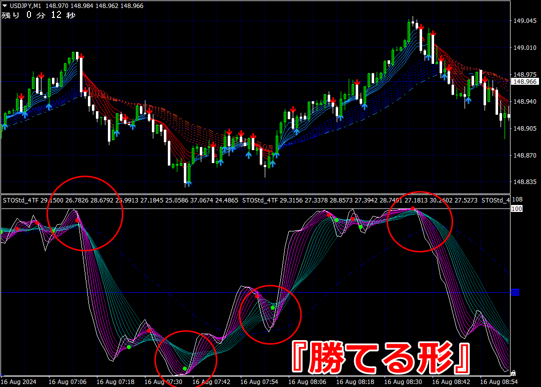 ② 矢印サイン点灯状態で、インジケーターのピンク色の帯が、緑の帯を下からすくい上げるような形状であれば、現在のローソク足が確定する数秒前か確定の直後に1分判定または3分判定でハイエントリーします。