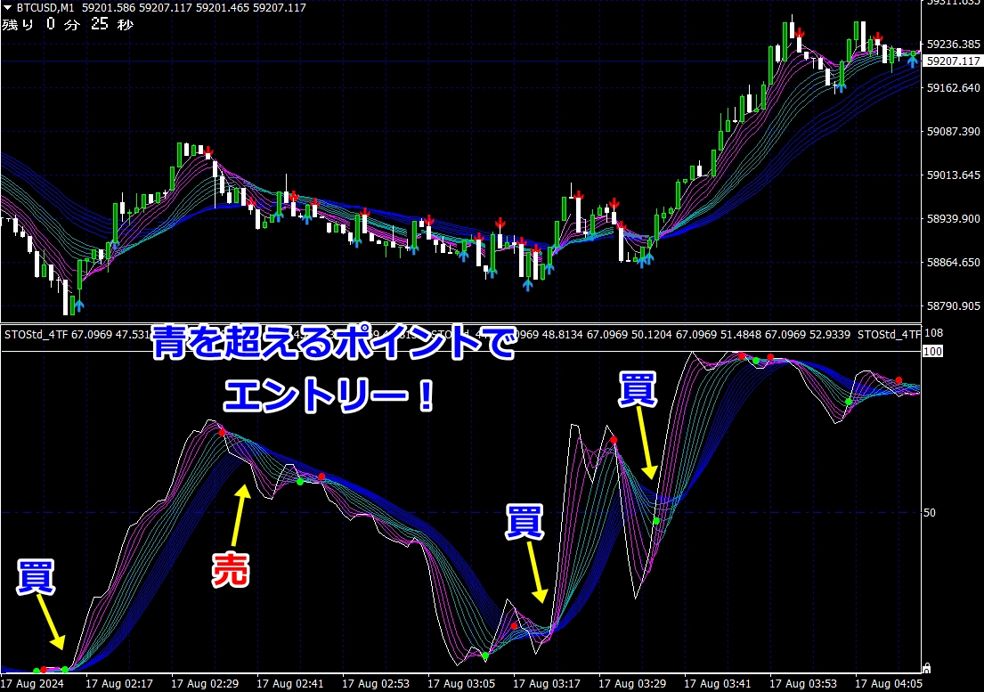 ② 矢印サイン点灯状態で、インジケーターのピンク色の帯が、緑の帯を下からすくい上げるような形状であれば、現在のローソク足が確定する数秒前か確定の直後に1分判定または3分判定でハイエントリーします。