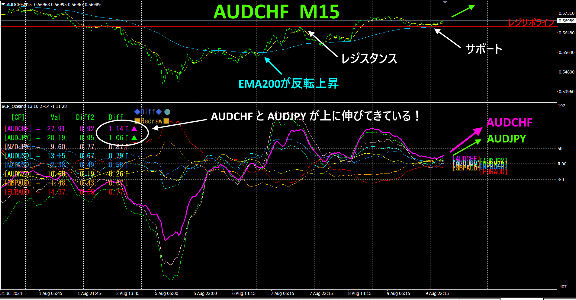 2024年8月12日のチャートですが、移動平均線EMA200が反転上昇した後、レジサポラインで支えられて上昇しています。下半分の「8CP見える化インジケータOceania」でも、AUDCHFが最も急角度で上に伸びていることが示されています。このような相場環境であれば、「買ったら下がる」という問題がまず発生しません。