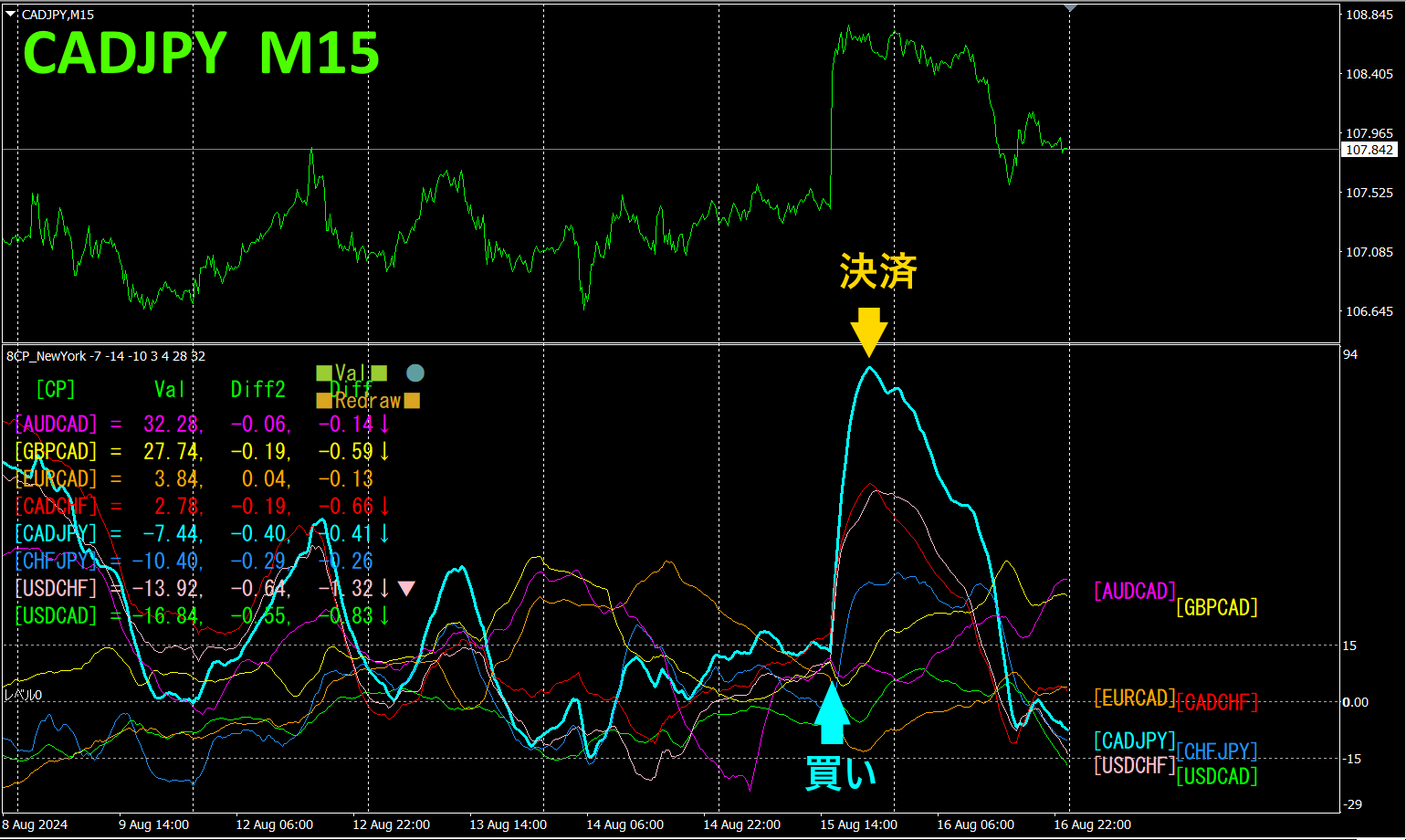 上半分は、CADJPYの15分足チャートです。下半分は、「8CP見える化インジケータ」によるものです、水色太線のグラフがCADJPYに相当します。