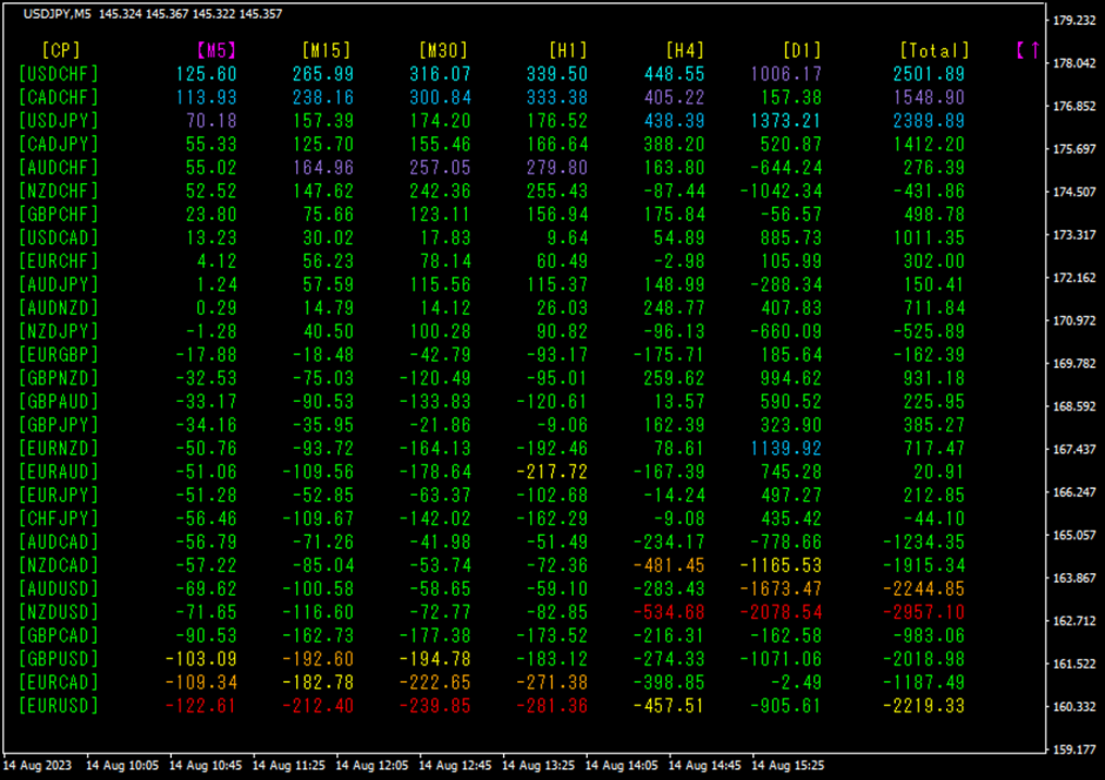 [M5]数値の降順に並んでいます。一番上の行にあるUSDCHFは、全ての時間足で青色系の表示色になっています。しかもTotal数値が2501.89と大きなプラスの数字になっています。USDCHFに上昇トレンドが発生していることを示しています。