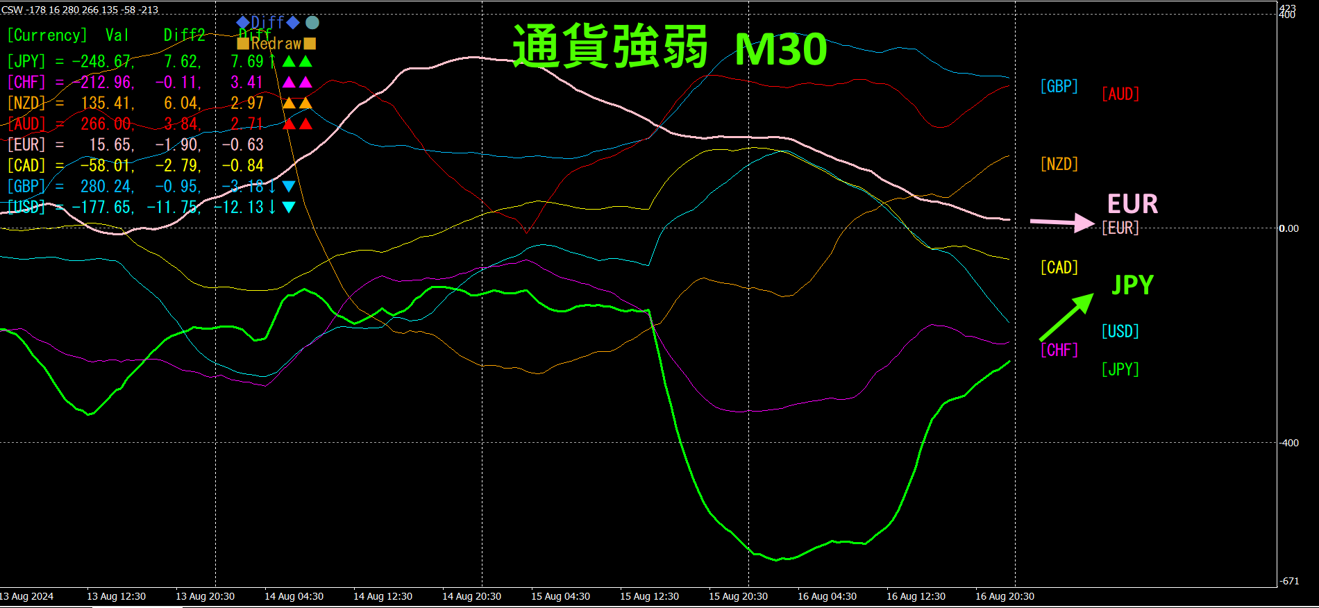 ピンク色がEUR、緑色がJPYです。JPYは上向きに、EURは、やや下向きになっています。従って、EURJPYは、今後、やや下降気味に推移するでしょう。