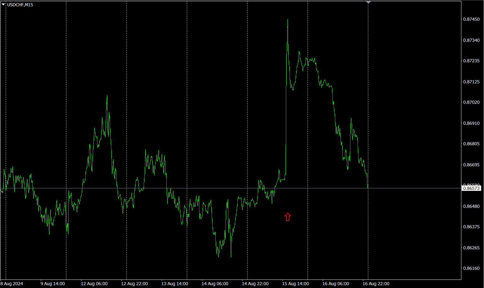 赤色の矢印がスクリーンショットを撮影した所です。急騰部分を捉えています。「TrendLine-EX」を仕掛けていれば、利益を得ることができました。