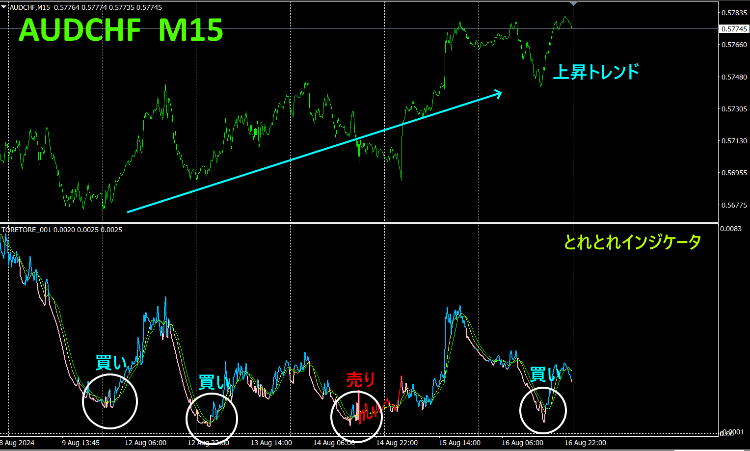 次に、AUDCHFの15分足に「とれとれインジケータ」を導入したチャートを示します。「とれとれインジケータ」の使い方は、インジケータのグラフがゼロライン近くまで下がってくるのを待って、反転してきてから、インジケータのカラーに従って、赤色なら売りポジションを、青色なら買いポジションを建てます。
