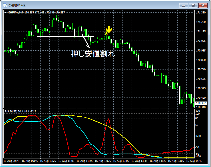 上の5分足では、押し安値を下抜けした後の上昇でmBDSR(RCI2本フィルター)の戻り売りサインが点灯し、その後、プライスは順調に下げている。