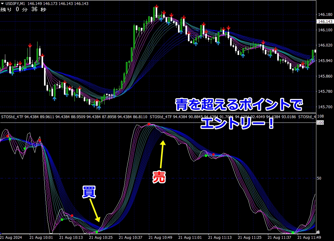 ② 矢印サイン点灯状態で、インジケーターのピンク色の帯が、緑の帯を下からすくい上げるような形状であれば、現在のローソク足が確定する数秒前か確定の直後に1分判定または3分判定でハイエントリーします。