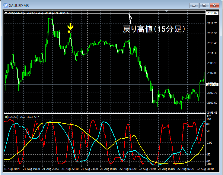 上の15分足では、白い円で囲ったあたりで戻り高値付近まで上昇している。反落の兆候がないか下位足で詳しく見てみることにする。