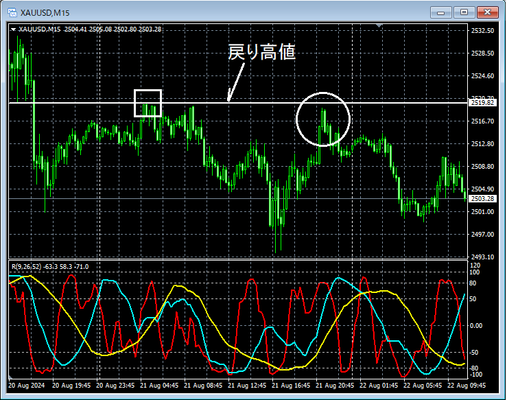 また、この例の場合、損切りラインを直近高値の少し上に置くことなどによりリスクリワードの良いトレードが可能である。