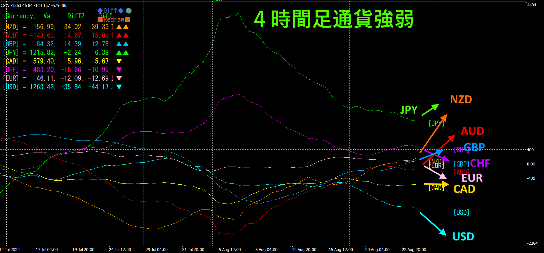 4時間足では、USD、EUR、CHFは下向きです。一方、NZD、AUD、GBP、JPYは上向きになっています。
