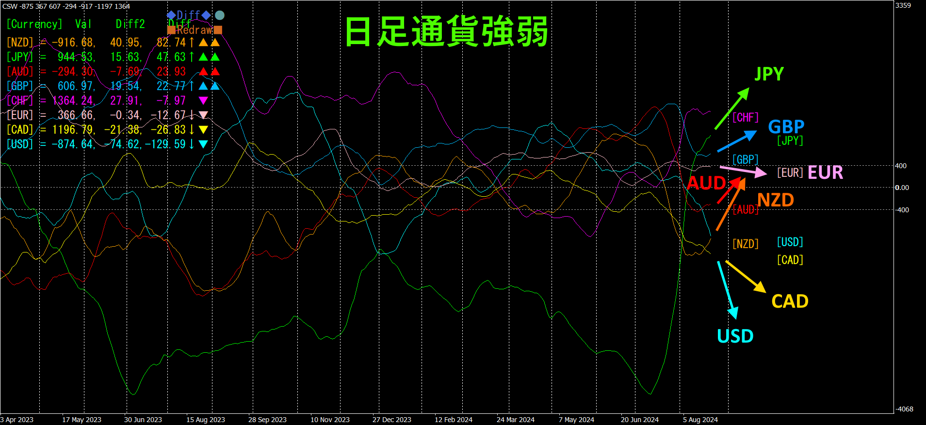 NZD、JPY、AUD、GBPが上向きです。一方、USD、CAD、EURが下向きになっています。日足通貨強弱チャートではNZDの上昇とUSDの下降が目立っています。