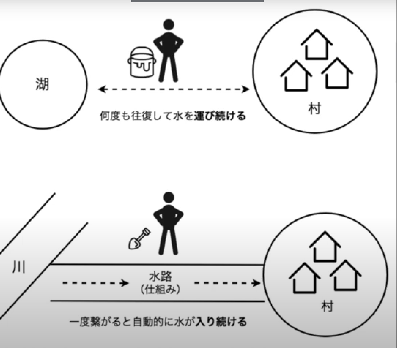 二人目の村人は、川から村へ水路を引くことで、最終的に水路という仕組みが村人不在でも水を運び、勝手に収入を発生させています。