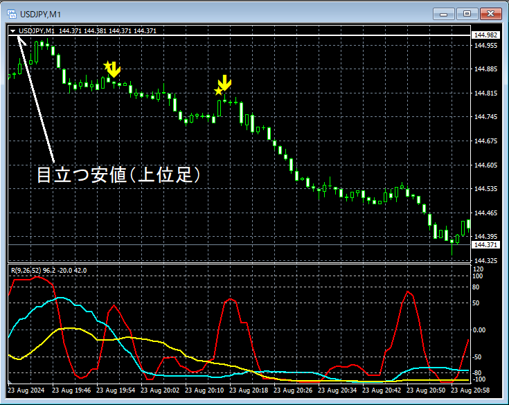 目立つ安値とロールリバーサルとmBDSR(RCI2本フィルター)の戻り売りサイン