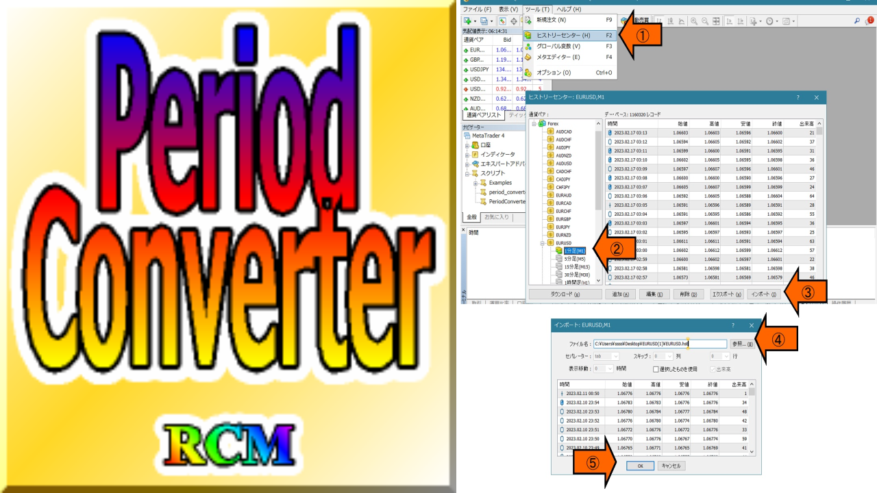 この手順では、PeriodConverter_rcmを使っています。このツールは、ワンクリックFXトレーニング、ワンクリック225トレーニングなどには、同封されています。