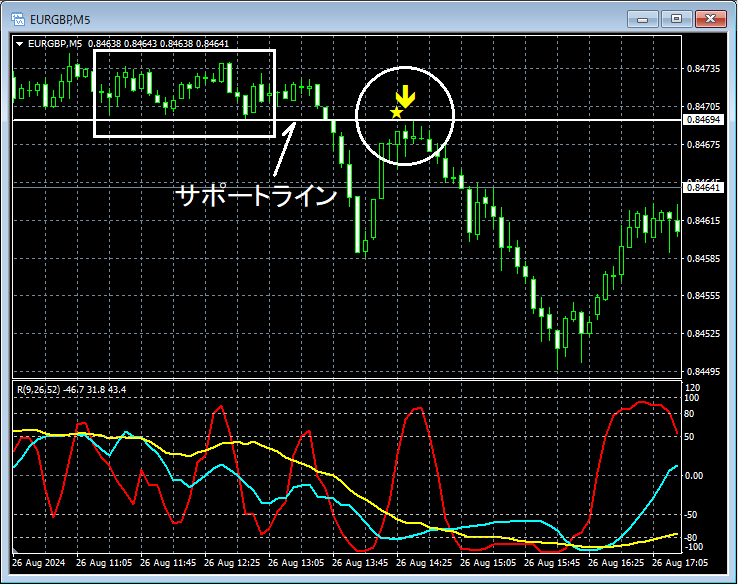 上の5分足では、サポートラインを下抜けした後、再度そのライン付近まで上昇したところでmBDSR(RCI2本フィルター)の戻り売りサインが点灯して、プライスは順調に下げている(いわゆるロールリバーサル(サポレジ転換))。