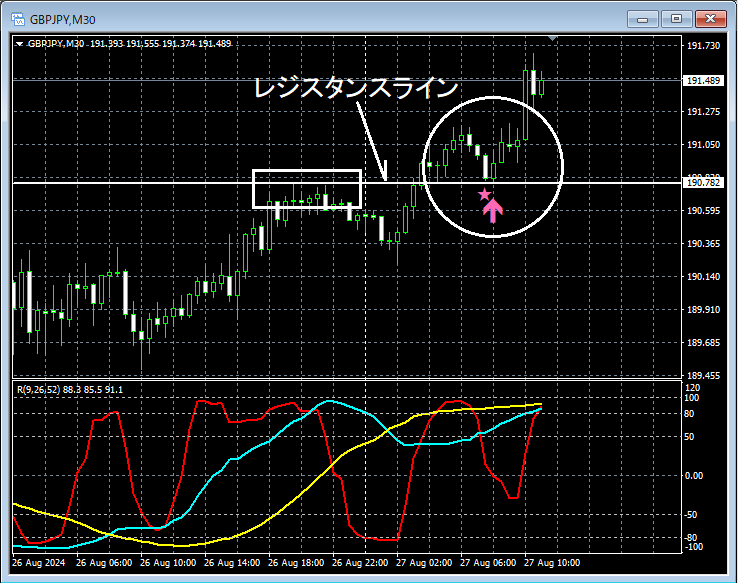 この例から、過去のレジスタンスライン(目立つ高値)やロールリバーサル(レジサポ転換)に注目したトレード手法とmBDSRのサインとの親和性の高さがうかがえる。