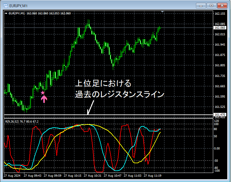 上の1分足では、上位足の過去のレジスタンスライン付近まで下げてきたところで反発気味。mBDSR(RCI2本フィルター)の押し目買いサインが点灯して、その後、プライスは順調に上昇している。