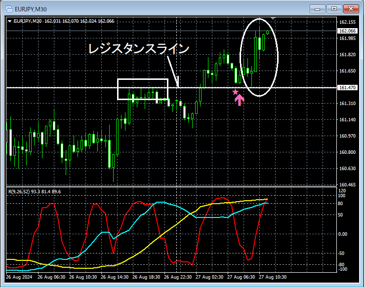 この例から、過去のレジスタンスライン(目立つ高値)やロールリバーサル(レジサポ転換)に注目したトレード手法とmBDSRのサインとの親和性の高さがうかがえる。