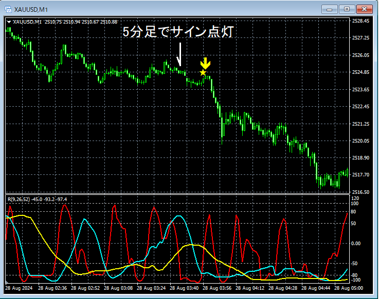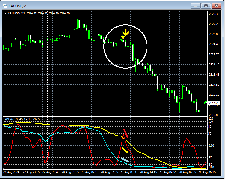 【本日のゴールドのチャートから】上位足でmBDSR(RCI2本フィルター)のサインが点灯した後に下位足でエントリーを検討する 2024年8月28日