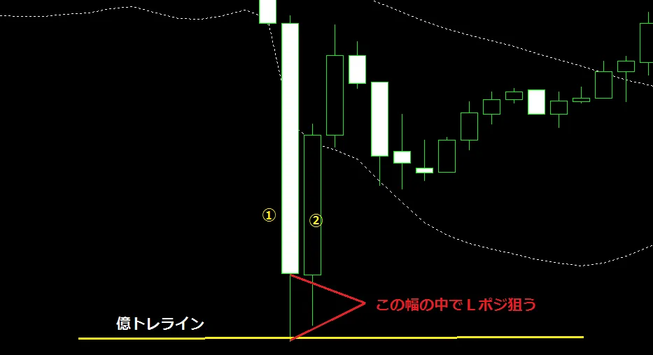毎回億トレラインでキッチリ反発する訳でないのですが、①ヒゲ内、現在のローソク足が陰線状態で動いている最中にLポジする事になります。