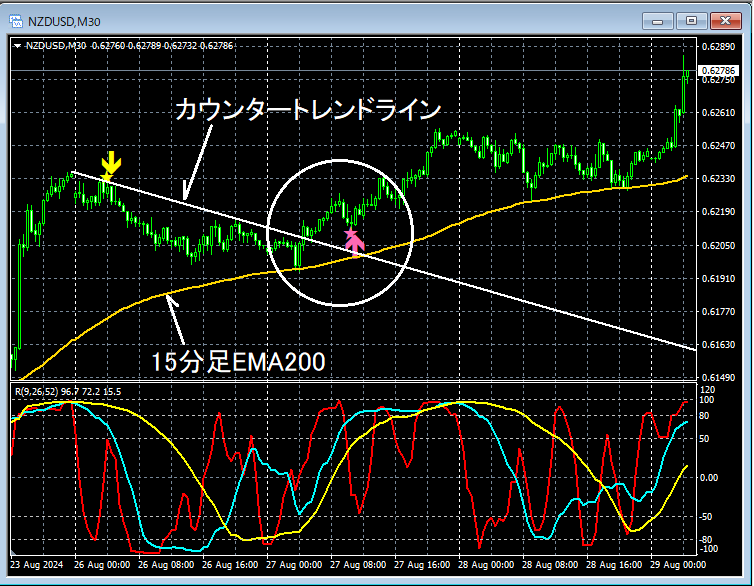 上位足の状況については省略。上の30分足では15分足EMA200付近で反発してカウンタートレンドラインを上抜けした後の下げでmBDSR(RCI2本フィルター)の押し目買いサインが点灯して大きく上昇している。