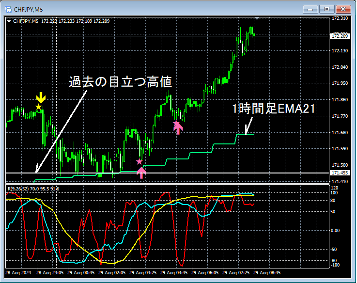 上の5分足では、1時間足EMA21と過去の目立つ高値を示すラインが重なるあたりで、mBDSR(RCI2本フィルター)の押し目買いサインが点灯して、その直後からプライスは大きく上昇している。