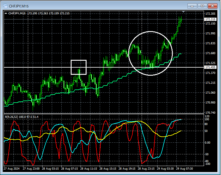 また、この例では、損切りラインを直近安値の少し下に置くことなどによりリスクリワードの良いトレードが可能である。