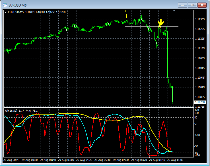 上の5分足では、4時間足EMA21(重要視している移動平均線)付近から反落。さらにサポートラインを下抜け。その後、そのサポートライン付近まで上昇したところでmBDSR(RCI2本フィルター)の戻り売りサインが点灯して大きく下げている(いわゆるサポレジ転換)。