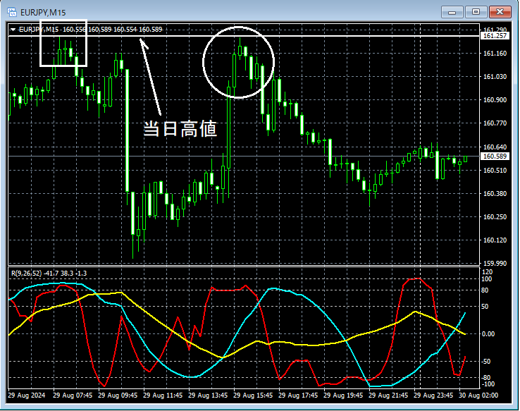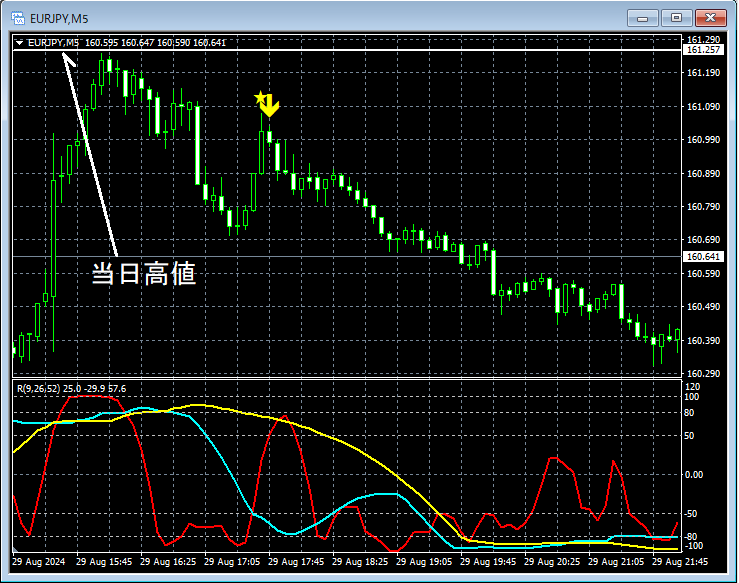 昨日(2024年8月29日)のユーロ円チャートから 当日高値とmBDSR(RCI2本フィルター)の戻り売りサイン