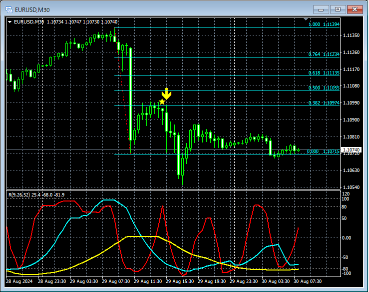 上の30分足では、急落後いったん反発。フィボナッチリトレースメントで38.2%戻しのあたりでmBDSR(RCI2本フィルター)のサインが点灯して、再度下げていることが分かる。