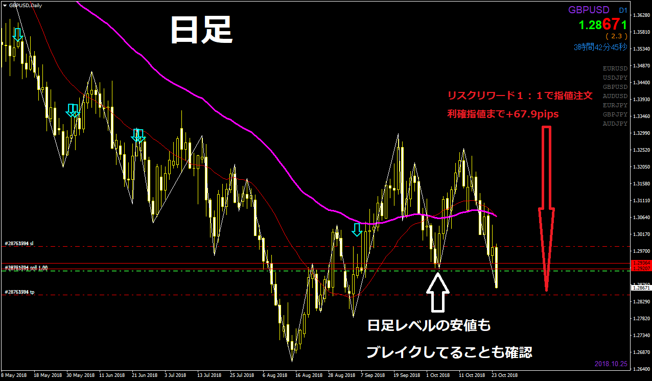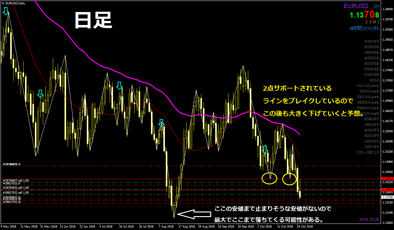 日足レベルのサポートラインもブレイクしていることを確認しました。