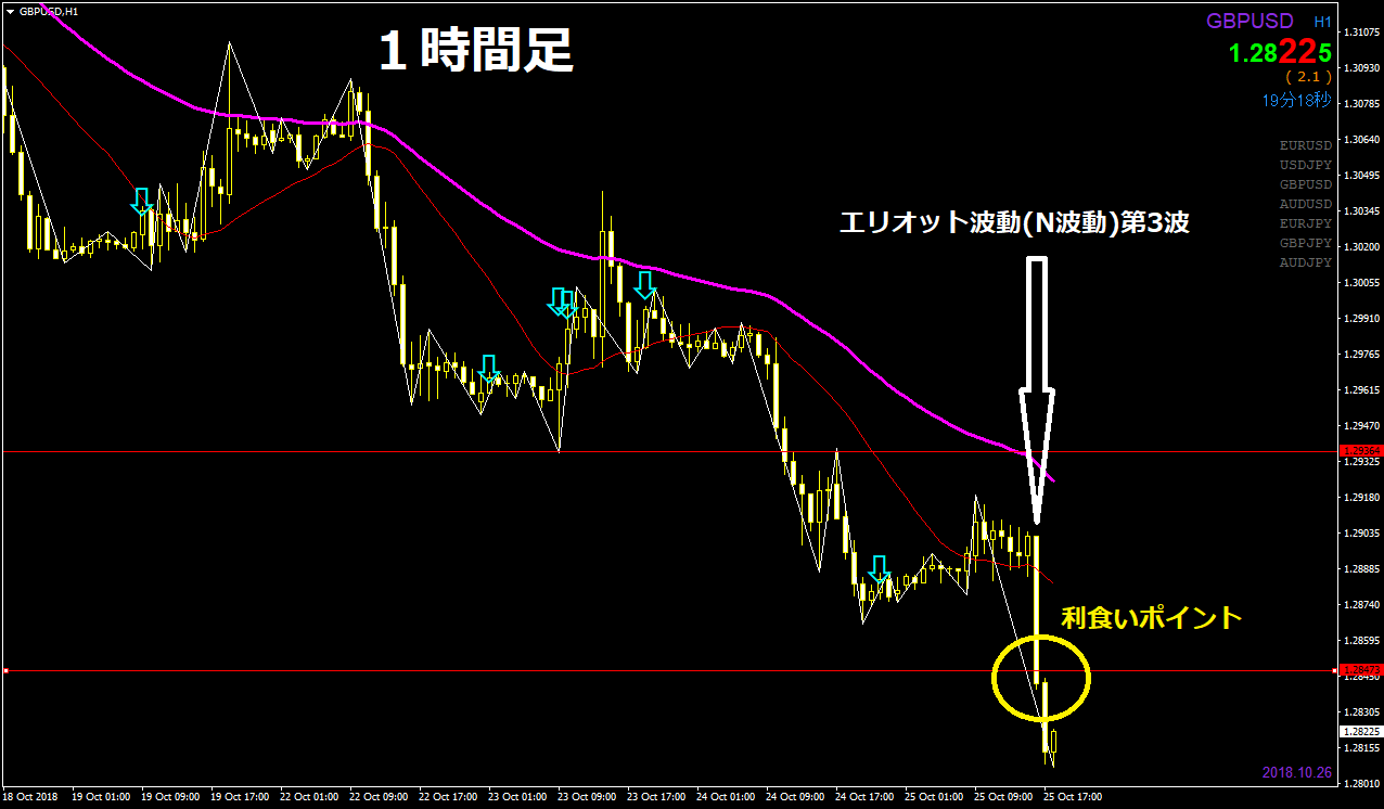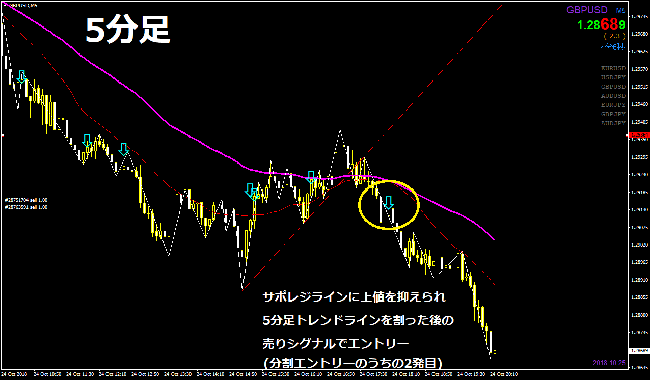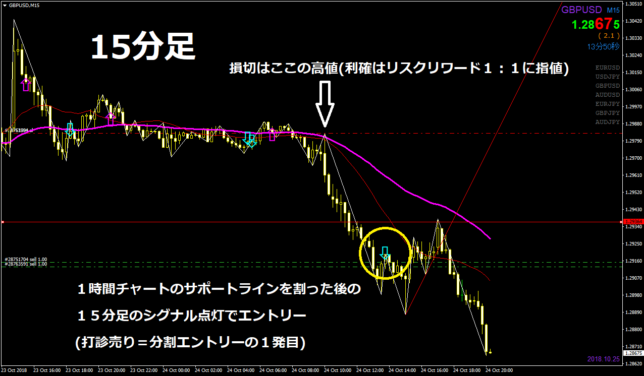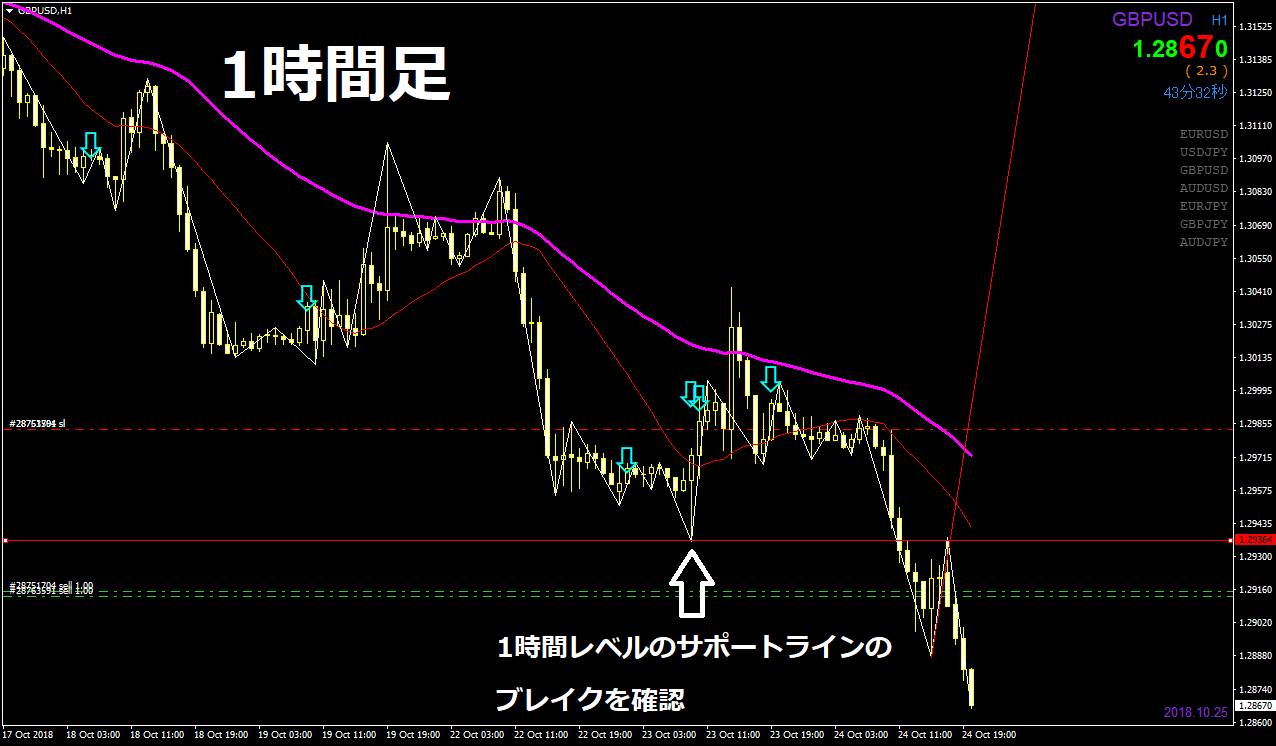 先ず1時間足レベルのサポートラインブレイクを確認しました。