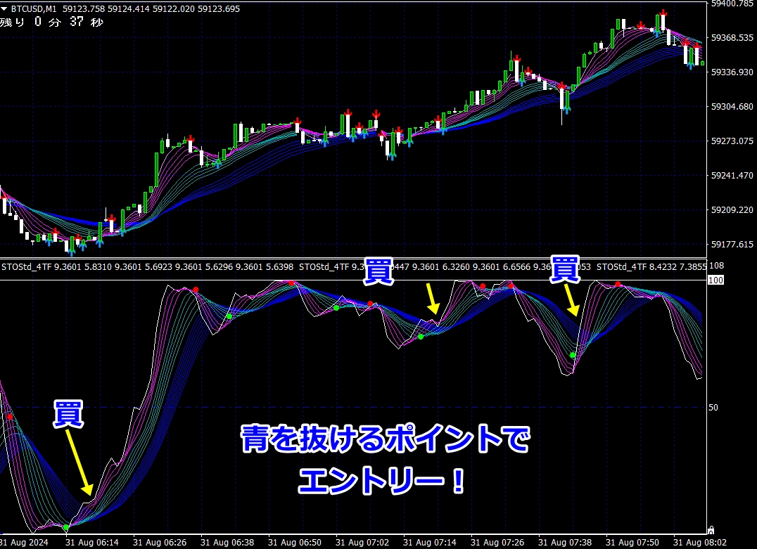 ② 矢印サイン点灯状態で、インジケーターのピンク色の帯が、緑の帯を下からすくい上げるような形状であれば、現在のローソク足が確定する数秒前か確定の直後に1分判定または3分判定でハイエントリーします。