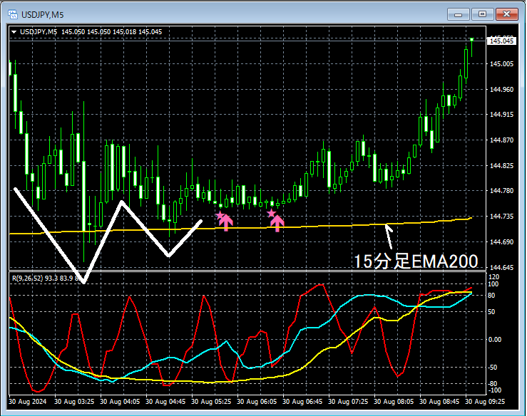 上位足の状況は省略。上の5分足では、重要視している15分足EMA200を明確に下抜けすることができずに反発気味。ダブルボトムを形成して反発する途中で、mBDSR(RCI2本フィルター)の押し目買いサインが2回点灯してプライスはしっかりと上昇している。