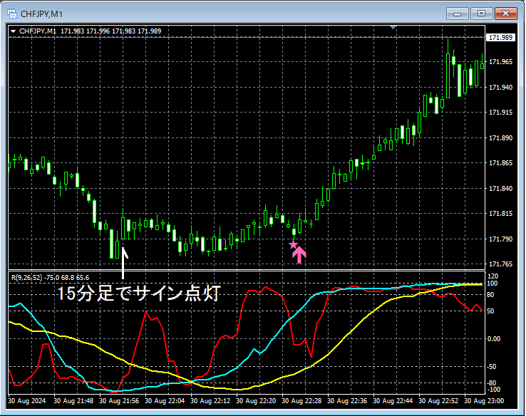 上の15分足では、mBDSR(移動平均線フィルター)の押し目買いサインが点灯している。ここでは、15分足でサインが点灯した後に、下位足で押し目買いのチャンスがないか見ていることにする。