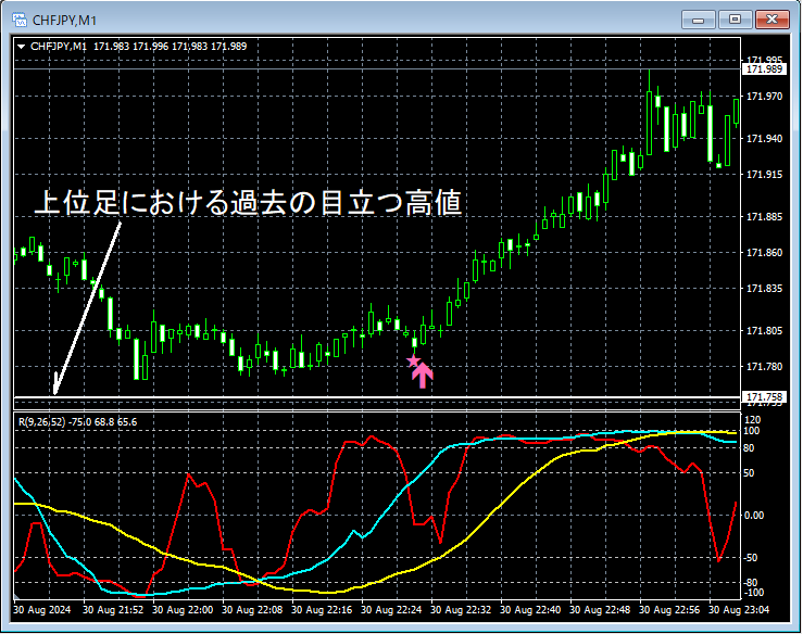 上位足における過去の目立つ高値とmBDSR(RCI2本フィルター)の押し目買いサイン