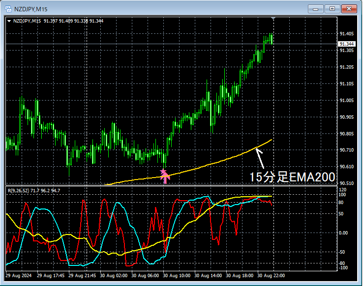 上位足の状況は省略。上の15分足では、重要視している15分足EMA200付近まで下げてきたところで、mBDSR(RCI2本フィルター)の押し目買いサインが点灯してプライスはしっかりと上昇している。