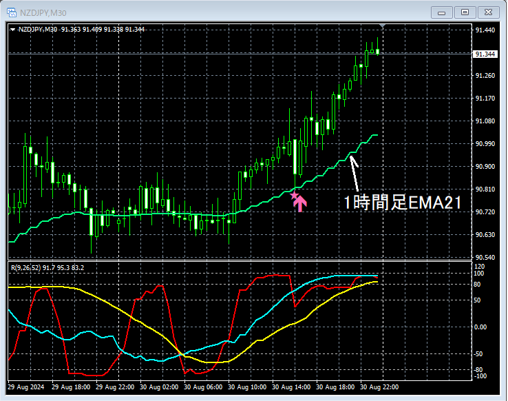 上位足の状況は省略。上の30分足では、重要視している1時間足EMA21付近まで下げてきたところで、mBDSR(RCI2本フィルター)の押し目買いサインが点灯してプライスはしっかりと上昇している。