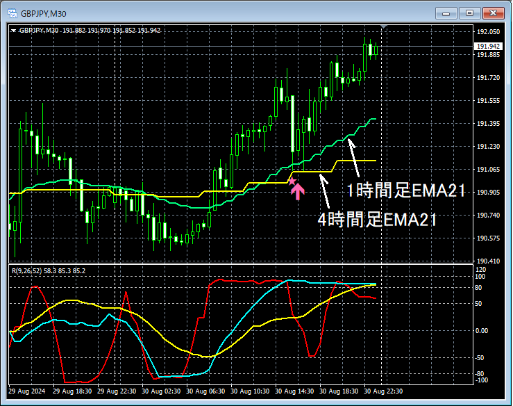 上の30分足では、4時間足EMA21と1時間足EMA21がゴールデンクロスした後に、それらの移動平均線付近まで下げてきたところでmBDSR(RCI2本フィルター)の押し目買いサインが点灯して、その後、プライスはしっかりと上昇している。