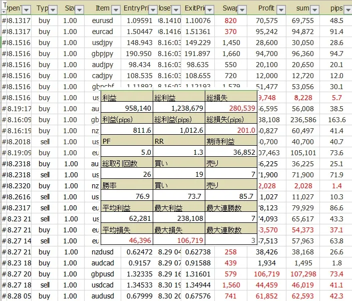 8月の収支もプラスで終えることができました。 前半は有効なブレイクアウトポイントが無く待つ日々が続きましたが、その反動もあり後半に大きな利益が出ました。先月までの様な一方的なトレンドではなく、停滞とブレイクアウトを数回繰り返すような相場でありながらもチャンスをつかむことができたと思います。