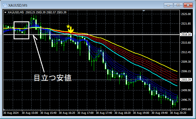 【mBDSR(移動平均線フィルター)の戻り売りサイン】目立つ安値に注目する (ゴールド XAUUSD)