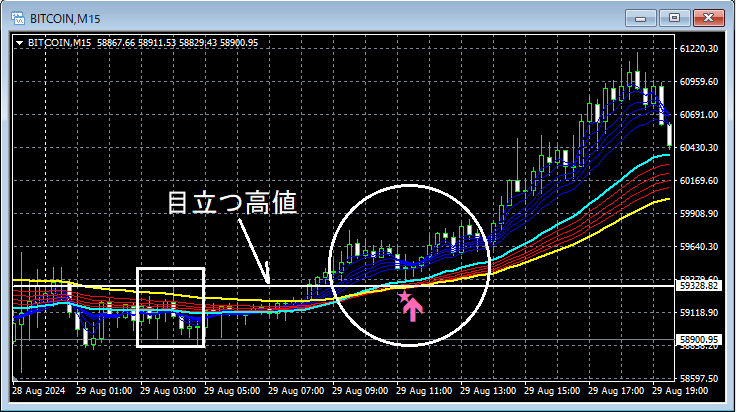 【mBDSR(移動平均線フィルター)の押し目買いサイン】目立つ高値に注目する(ビットコイン)(2)