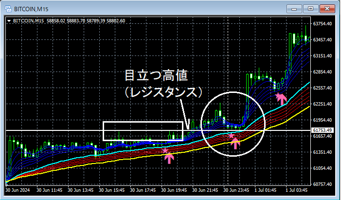 【mBDSR(移動平均線フィルター)の押し目買いサイン】目立つ高値に注目する(ビットコイン)(3)