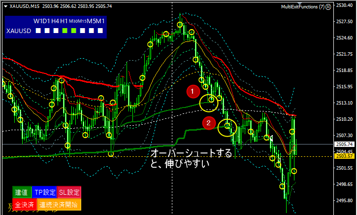 左側の緑の線は、抵抗として機能していますが、右の①の線は、2回抵抗となった後、オーバーシュートしています。その後伸びているのがわかります。