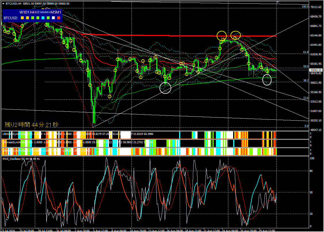 以下のスクショに右黄色〇印は、4時間足MKチャネル偏差3倍とビタ被りです。