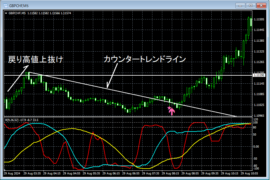 上の5分足では、戻り高値上抜けからいったん下げてからの上昇でカウンタートレンドラインを上抜け。その後の下げでmBDSR(RCI2本フィルター)の押し目買いサインが点灯して大きく上昇している。