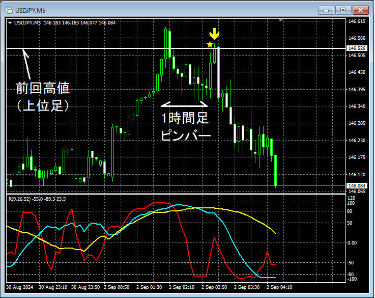 上の5分足では、1時間足でピンバー(上ヒゲの長いローソク足)が出現したのに伴って下落してきた後の上昇で、mBDSR(RCI2本フィルター)の戻り売りサインが点灯してプライスはしっかりと下げている。