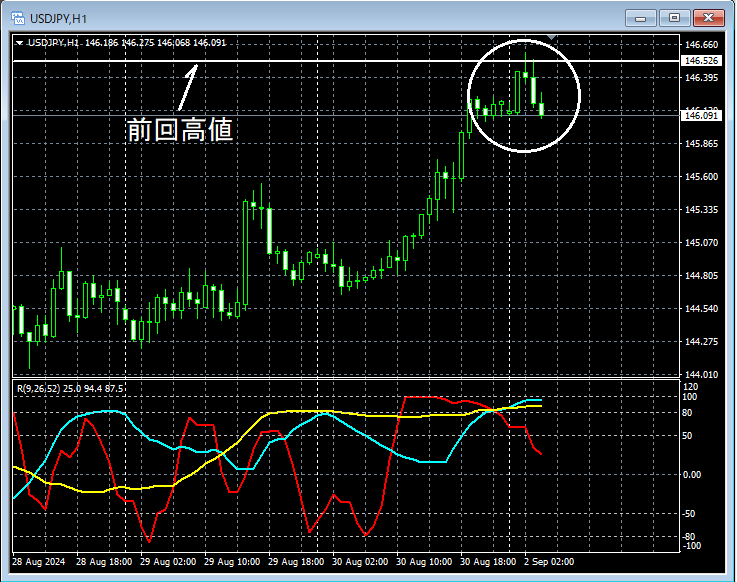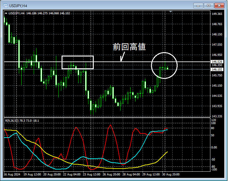 上の1時間足で白い円で囲ったあたりを見ると、4時間足レベルの前回高値付近まで上昇したところで、下落を示唆するピンバー(上ヒゲの長いローソク足)が出現しており、下位足で戻り売りを考えてもおかしくない場面かもしれない。