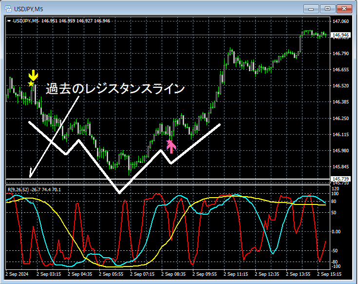 上位足の状況は省略。上の5分足では、過去にレジスタンスとして機能していたライン付近まで下げたところで逆三尊を形成して反発。結果として逆三尊の右側の谷における上昇開始のタイミングをmBDSR(RCI2本フィルター)の押し目買いサインが上手くとらえている。