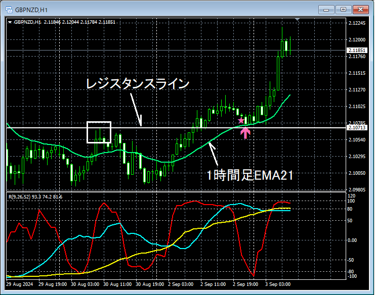 上の1時間足では、レジスタンスラインを上抜けした後、そのラインと1時間足EMA21が重なるあたりまで下げてきたところでmBDSR(RCI2本フィルター)の押し目買いサインが点灯して、その後、プライスは順調に上昇している(いわゆるロールリバーサル(レジサポ転換))。