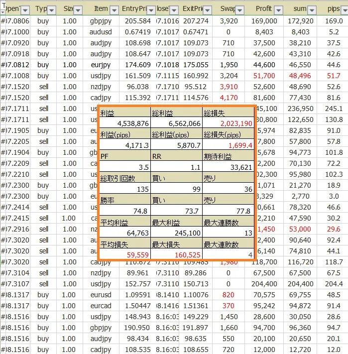 合計利益は約+450万円、+4,171pips、勝率75%、PF3.5と現時点では非常に良い成績を残せています。